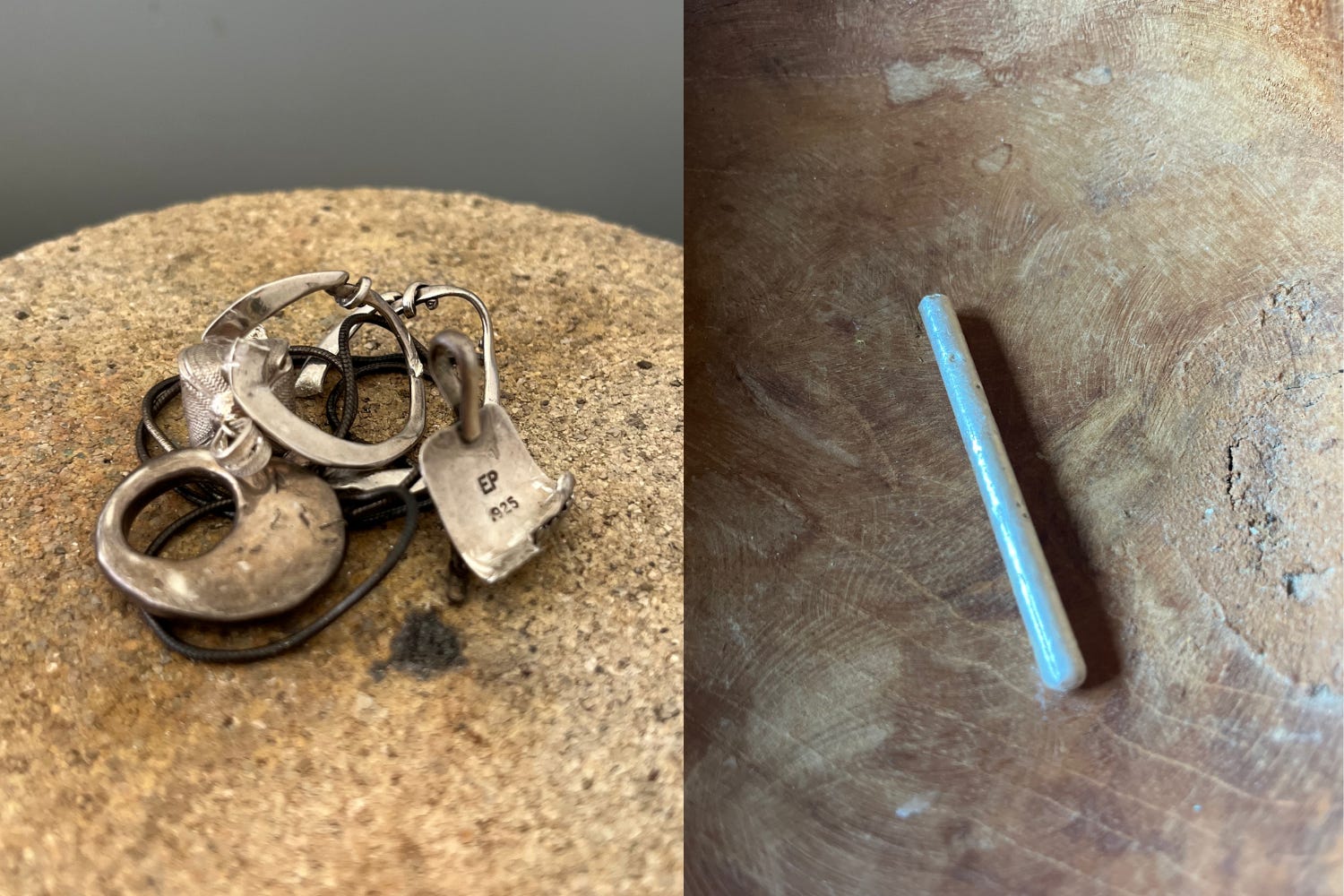Looking through my pile of old jewelry no longer worn or wanted, Sophie sorted the pieces into what was most likely pure silver that could be melted down. She and I took one pile to the bench area equipped with a crucible and melting torch, where she showed me how to clean the ingot mold and put it back together properly.